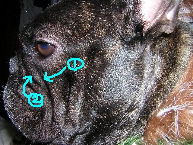 はじめまして。多頭飼いの者です。 うちの♂が同じような症状になった時がありました。 少し内容から脱線しますがシワラインです。 1歳過ぎの写真ですが、 @シワラインは涙、目ヤニなどで蒸れるので普段お手入れバッチリ。 しかしAのライン。鼻上よりつながってるラインです。 何の気なしに顔遊びをしていたら・・・カスがこってりとたまっていました。 原因としてはたっぷりとシワが深いため、奥までキレイに手入れが出来ていなかったと。。。 このときは寒い時期だったのですが、この時期だと・・・臭そうです。 手入れは病院で処方されている電子活性水や市販のペットクールで拭くのと、 あとは就寝前に蒸しタオルで念入りに。 やはり清潔維持ですよね。一日でも欠かすと荒れてます。 | ||