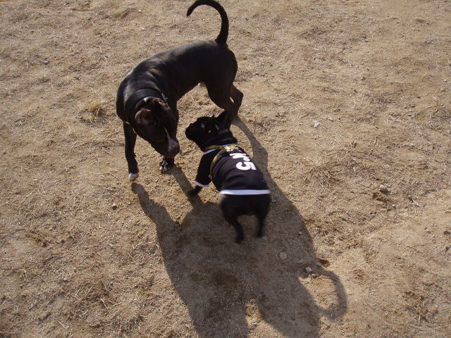 今日、BUHI会にて憧れのアメリカンピットブルに初めてお会いしました! 感激〃⌒ー⌒〃 ウレシイ〜☆・:.;* うちのBUHIちゃんいつもの調子でピットブルめがけて走り出した瞬間食べられる〜と、一瞬思いましたがとてもやさしくていい仔で良かったです。 でも怖かった〜〜〜^^; | ||